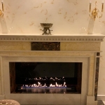 От визуализации до воплощения. Облицовка мрамор, мдф, очаг из нержавеющей стали с каминным черным стеклом (задняя часть), декоративная рамка из латуни, топливный блок Direct Cheminee.